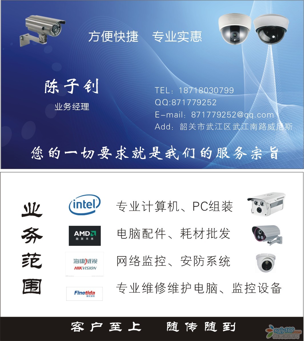 正文摘要:服務(wù)形式:上門(mén)維修 服務(wù)口號(hào):客戶至上,隨傳隨到 服務(wù)項(xiàng)目: 上門(mén)電腦維修服務(wù),上網(wǎng)故障,電腦慢,死機(jī),更換系統(tǒng),路由器寬帶設(shè)置,無(wú)線WIFI安裝,電腦升級(jí)組裝,監(jiān)控報(bào)裝等等,只需一個(gè)電話幫您 ... |