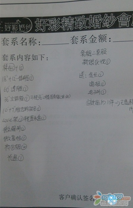 正文摘要:人于8月14號在好彩婚紗攝影約定了一套婚紗照原價(jià)5999元(惠州奧地利小鎮(zhèn)攝影基地3套衣服+仁化好彩專用奧斯卡攝影基地3套衣服)。 和店員協(xié)商后優(yōu)惠價(jià)為5299元,另外贈送一套全新婚紗。   ... |
